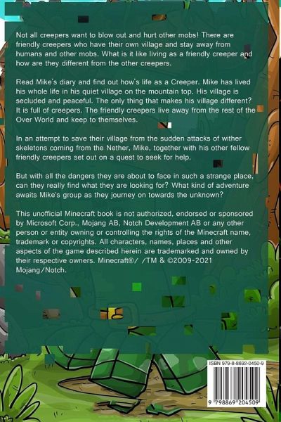 Not all creepers want to blow up and hurt other mobs! There are friendly creepers who have their own village and stay away from humans and other mobs. What is it like living as a friendly creeper and how are they different from the other creepers. Read Mike's diary and find out how's life as a Creeper. Mike has lived his whole life in his quiet village on the mountain top. His village is secluded and peaceful. The only thing that makes his village different? It is full of creepers. The friendly creepers live away from the rest of the Over World and keep to themselves. In an attempt to save their village from the sudden attacks of wither skeletons coming from the Nether, Mike, together with his other fellow friendly creepers set out on a quest to seek for help. But with all the dangers they are about to face in such a strange place, can they really find what they are looking for? What kind of adventure awaits Mike's group as they journey on towards the unknown? An Unofficial Minecraft Diary Book for Kids Ages 9 - 12 (Preteen / Thrilling Minecraft Adventure / Minecraft Novel THIS MINECRAFT ADVENTURE STORY IS A MUST READ FOR MINECRAFT FANS ESPECIALLY FOR KIDS AGE 5-7 , 6-8 , 8-10 , 9-12 , THIS EXCITING MINECRAFT BOOK IS MADE for ages 6, 7, 8, 9, 10, 11, 12 and older. MOTIVATE YOUR 8 YEAR OLD BOYS AND GIRLS OR MINECRAFT KIDS AGES 9-12 TO READ WITH THIS EXCITING STORY. THE PERFECT GIFT IDEA FOR MINECRAFT FANS! GET YOUR COPY NOW!!! This unofficial Minecraft book is not authorized, endorsed or sponsored by Microsoft Corp., Mojang AB, Notch Development AB or any other person or entity owning or controlling the rights of the Minecraft name, trademark or copyrights. All characters, names, places and other aspects of the game described herein are trademarked and owned by their respective owners. Minecraft®/ /TM & (c)2009-2016 Mojang/Notch.