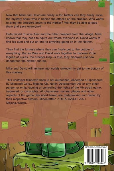 Now that Mike and David are finally in the Nether can they finally solve the mystery about who is behind the attacks on the creeper. Who wants to bring the creepers down to the Nether? Will they be able to stop them and save everyone? Determined to save Alex and the other creepers from the village, Mike knows that they need to figure out where everyone is. David wants to find his aunt and put an end to anything going on in the Nether. They find the fortress where they can finally get to the bottom of everything. But as Mike and David work together to discover if the legend of Lucas, the creeper king, is true, they discover just how dangerous the Nether can be. Mike and David will venture into worlds unknown to get to the bottom of this mystery. An Unofficial Minecraft Diary Book for Kids Ages 9 - 12 (Preteen / Thrilling Minecraft Adventure / Minecraft Novel THIS MINECRAFT ADVENTURE STORY IS A MUST-READ FOR MINECRAFT FANS ESPECIALLY FOR KIDS AGE 5-7 , 6-8 , 8-10 , 9-12 , THIS EXCITING MINECRAFT BOOK IS MADE for ages 6, 7, 8, 9, 10, 11, 12 and older. MOTIVATE YOUR 8-YEAR-OLD BOYS AND GIRLS OR MINECRAFT KIDS AGES 9-12 TO READ WITH THIS EXCITING STORY. THE PERFECT GIFT IDEA FOR MINECRAFT FANS! GET YOUR COPY NOW!!! This unofficial Minecraft book is not authorized, endorsed or sponsored by Microsoft Corp., Mojang AB, Notch Development AB or any other person or entity owning or controlling the rights of the Minecraft name, trademark or copyrights. All characters, names, places and other aspects of the game described herein are trademarked and owned by their respective owners. Minecraft®/ /TM & ©2009-2016 Mojang/Notch.