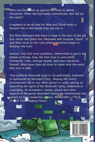 Mike and David are up against the clock to defeat Herobrine. When the final battle commences, who will be the victor? It appears to be all over for Mike and David when a blizzard hits in the woods they are lost in. But Mike discovers that there is hope in the form of the gift that Jacob has given him. Renewed with purpose, David and Mike travel to the ruins where Herobrine begins to discover the truth. Instead, they find more questions. Determined to get to the bottom of things, they risk their lives to save the Overworld. Yetis, strange beasts, and even Herobrine himself, Mike faces them all down to make sure the world they love is safe. An Unofficial Minecraft Diary Book for Kids Ages 9 - 12 (Preteen / Thrilling Minecraft Adventure / Minecraft Novel THIS MINECRAFT ADVENTURE STORY IS A MUST-READ FOR MINECRAFT FANS ESPECIALLY FOR KIDS AGE 5-7 , 6-8 , 8-10 , 9-12 , THIS EXCITING MINECRAFT BOOK IS MADE for ages 6, 7, 8, 9, 10, 11, 12 and older. MOTIVATE YOUR 8-YEAR-OLD BOYS AND GIRLS OR MINECRAFT KIDS AGES 9-12 TO READ WITH THIS EXCITING STORY. THE PERFECT GIFT IDEA FOR MINECRAFT FANS! GET YOUR COPY NOW!!! This unofficial Minecraft book is not authorized, endorsed or sponsored by Microsoft Corp., Mojang AB, Notch Development AB or any other person or entity owning or controlling the rights of the Minecraft name, trademark or copyrights. All characters, names, places and other aspects of the game described herein are trademarked and owned by their respective owners. Minecraft®/ /TM & (c)2009-2016 Mojang/Notch.