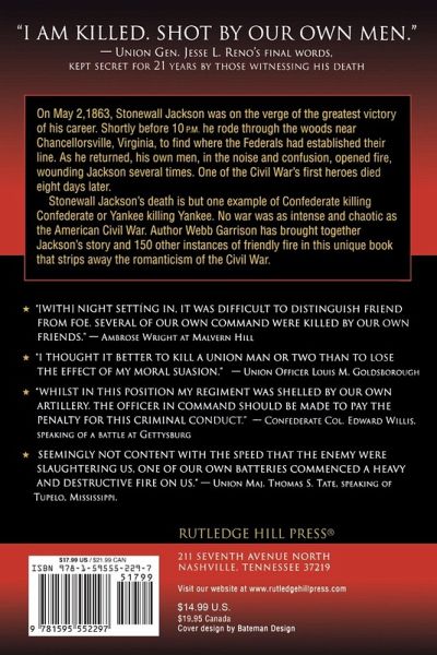 More than 100 true stories of comrade killing comrade: defective ammunition accidental shootings blinding smoke deliberate fire upon comrade mistaken uniforms inexperienced troops unknown passwords On May 2, 1863, Stonewall Jackson was on the verge of the greatest victory of his career. Shortly before 10 P.M. he rode through the woods near Chancellorsville, Virginia, to find where the Federals had established their line. As he returned, his own men, in the noise and confusion, opened fire, woulding Jackson several times. One of the Civil War's first heroes died eight days later. Stonewall Jackson's death is but one example of Confederate killing Confederate or Yankee killing Yankee. No war was as intense and chaotic as the American Civil War. Author Webb Garrison has brought together Jackson's story and 150 other instances of friendly fire in this unique book that strips away the romanticism of the Civil War. "[With] night setting in, it was difficult to distinguish friend from foe. Several of our own command were killed by our own friends." ?Ambrose Wright at Malvern Hill "I thought it better to kill a Union man or two than to lose the effect of my moral suasion." ?Union Officer Louis M. Goldsborough "Whilst in this position my regiment was shelled by our own artillery. The officer in command should be made to pay the penalty for this criminal conduct." ?Confederate Col. Edward Willis, speaking of a battle at Gettysburg "Seemingly not content with the speed that the enemy were slaughtering us, one of our own batteries commenced a heavy and destructive fire on us." ?Union Maj. Thomas S. Tate, speaking of Tupelo, Mississippi