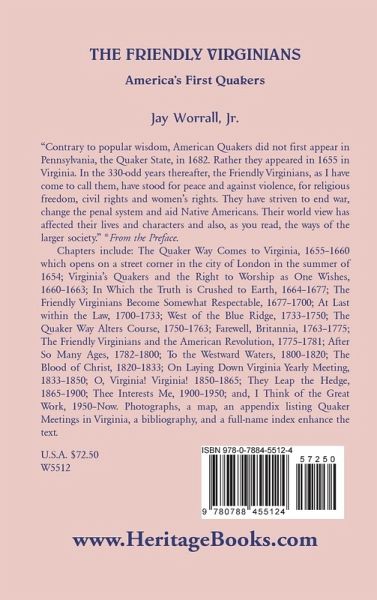 "Contrary to popular wisdom, American Quakers did not first appear in Pennsylvania, the Quaker State, in 1682. Rather they appeared in 1655 in Virginia. In the 330-odd years thereafter, the Friendly Virginians, as I have come to call them, have stood for peace and against violence, for religious freedom, civil rights and women's rights. They have striven to end war, change the penal system and aid Native Americans. Their world view has affected their lives and characters and also, as you read, the ways of the larger society." *From the Preface. Chapters include: The Quaker Way Comes to Virginia, 1655-1660 which opens on a street corner in the city of London in the summer of 1654; Virginia's Quakers and the Right to Worship as One Wishes, 1660-1663; In Which the Truth is Crushed to Earth, 1664-1677; The Friendly Virginians Become Somewhat Respectable, 1677-1700; At Last within the Law, 1700-1733; West of the Blue Ridge, 1733-1750; The Quaker Way Alters Course, 1750-1763; Farewell, Britannia, 1763-1775; The Friendly Virginians and the American Revolution, 1775-1781; After So Many Ages, 1782-1800; To the Westward Waters, 1800-1820; The Blood of Christ, 1820-1833; On Laying Down Virginia Yearly Meeting, 1833-1850; O, Virginia! Virginia! 1850-1865; They Leap the Hedge, 1865-1900; Thee Interests Me, 1900-1950; and, I Think of the Great Work, 1950-Now. Photographs, a map, an appendix listing Quaker Meetings in Virginia, a bibliography, and a full-name index enhance the text.