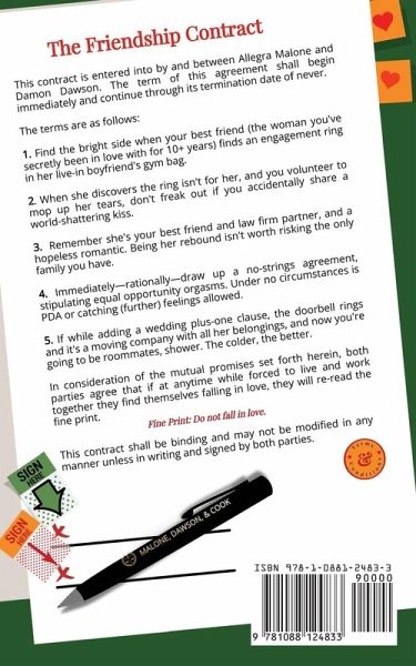 From bestselling author, Mia Heintzelman comes a heart-warming story of heart, humor, and heat in this friends-to-lovers romance about finding love in unexpected places. THE FRIENDSHIP CONTRACT This contract is entered into by and between Allegra Malone and Damon Dawson. The term of this agreement shall begin immediately and continue through its termination date of never. The terms are as follows: 1. Find the bright side when your best friend (the woman you've secretly been in love with for 10+ years) finds an engagement ring in her live-in boyfriend's gym bag. 2. When she discovers the ring isn't for her, and you volunteer to mop up her tears, don't freak out if you accidentally share a world-shattering kiss. 3. Remember she's your best friend and law firm partner...and a hopeless romantic. Being her rebound isn't worth risking the only family you have. 4. Immediately-rationally-draw up a no-strings agreement, stipulating equal opportunity orgasms. Under no circumstances is PDA or catching (further) feelings allowed. 5. If while adding a wedding plus-one clause, the doorbell rings and it's a moving company with all her belongings, and now you're going to be roommates, shower. The colder, the better. In consideration of the mutual promises set forth herein, both parties agree that if at any time while forced to live and work together they find themselves falling in love, they will re-read the fine print. Fine Print: Do not fall in love. This contract shall be binding and may not be modified in any manner unless in writing and signed by both parties.