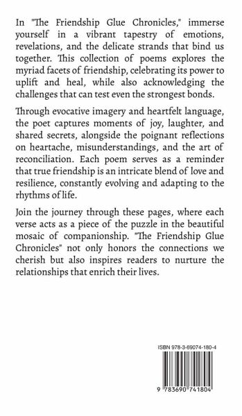 In "The Friendship Glue Chronicles," immerse yourself in a vibrant tapestry of emotions, revelations, and the delicate strands that bind us together. This collection of poems explores the myriad facets of friendship, celebrating its power to uplift and heal, while also acknowledging the challenges that can test even the strongest bonds. Through evocative imagery and heartfelt language, the poet captures moments of joy, laughter, and shared secrets, alongside the poignant reflections on heartache, misunderstandings, and the art of reconciliation. Each poem serves as a reminder that true friendship is an intricate blend of love and resilience, constantly evolving and adapting to the rhythms of life. Join the journey through these pages, where each verse acts as a piece of the puzzle in the beautiful mosaic of companionship. "The Friendship Glue Chronicles" not only honors the connections we cherish but also inspires readers to nurture the relationships that enrich their lives.