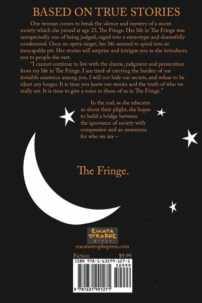 One woman comes to break the silence and mystery of a secret society which she joined at age 23, The Fringe. Her life in The Fringe was unexpectedly one of being judged, caged into a stereotype and shamefully condemned. Once an opera singer, her life seemed to spiral into an inescapable pit. Her stories will surprise and intrigue you as she introduces you to people she met. "I cannot continue to live with the shame, judgment and persecution from my life in The Fringe. I am tired of carrying the burden of our invisible existence among you. I will not hide our secrets, and refuse to be silent any longer. It is time you knew our stories and the truth of who we really are. It is time to give a voice to those of us in The Fringe." In the end, as she educates us about their plight, she hopes to build a bridge between the ignorance of society with compassion and an awareness for who we are - The Fringe.