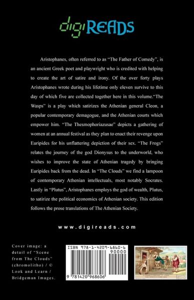 Aristophanes, often referred to as "The Father of Comedy", is an ancient Greek poet and playwright who is credited with helping to create the art of satire and irony. Of the over forty plays Aristophanes wrote during his lifetime only eleven survive to this day of which five are collected together here in this volume."The Wasps" is a play which satirizes the Athenian general Cleon, a popular contemporary demagogue, and the Athenian courts which empower him. "The Thesmophoriazusae" depicts a gathering of women at an annual festival as they plan to enact their revenge upon Euripides for his unflattering depiction of their sex. "The Frogs" relates the journey of the god Dionysus to the underworld, who wishes to improve the state of Athenian tragedy by bringing Euripides back from the dead. In "The Clouds" we find a lampoon of contemporary Athenian intellectuals, most notably Socrates. Lastly in "Plutus", Aristophanes employs the god of wealth, Plutus, to satirize the political economics of Athenian society. This edition follows the prose translations of The Athenian Society and is printed on premium acid-free paper.