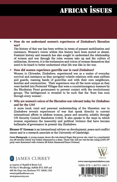 A Zimbabwe-specific study, focusing on the lives of women in a small locale (Chiweshe) during the anti-colonial insurgency, this book is also a challenge to established and still current modes of thought and research orientations which over-simplify the complex realities women face in the full range of violent conflicts, both past and present. By contextualizing the voices of women of Chiweshe, not only is an important and under-developed aspect of Zimbabwean and African history revealed, but a new approach to comprehending the highly-tensioned lives of women in war is presented, which is characterized here as Gendered Localised Resistance. This is examined through the prism of life in the Protected Villages in Chiweshe experienced in everyday social relations, revolutionary roles, and food security. It traces how women forged strategies of survival and resistance in the middle of guerrilla warfare pitted between the forces of the state and the revolutionary resistance movements. The book can be read as a unique and richly detailed account of the lives of women during the Zimbabwe civil war and liberation struggle; as a wider argument about how researchers can approach and incorporate lived experience into accounts of larger dynamics (war/revolution); and as a substantial and important contribution to feminist historiography and writings on women and war. Eleanor O' Gorman is Senior Associate at the Gender Studies Centre and a Research Associate at the Department of Politics and International Studies at the University of Cambridge; an independent consultant who has advised the UN, the UK Government (DFID and FCO), the Irish Department of Foreign Affairs, the European Commission, and the Organisation for Economic Cooperation and Development (OECD) Zimbabwe: Weaver Press
