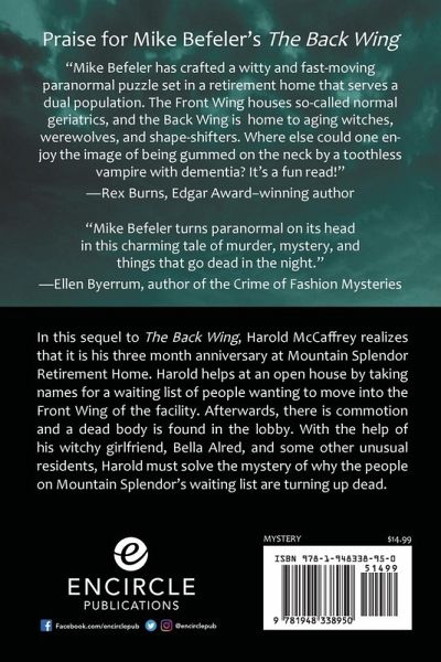 In this sequel to The Back Wing, Harold McCaffrey realizes this is his three month anniversary at Mountain Splendor Retirement Home. Harold helps at an open house by taking names for a waiting list of people wanting to move into the Front Wing of the facility. Afterwards, there is commotion and a dead body is found dead in the lobby. With the help of his witchy girl friend, Bella Alred, and other unusual residents, Harold must solve the mystery of why people on the waiting list are dying.