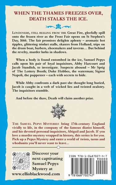 When the Thames freezes over, Death shall stalk the ice. St Stephen's Day, 1666. Londoners, still scarred by fire, flock to the Frost Fair - a carnival on ice with puppet shows and skating, taverns and gambling booths. But beneath the revels, something darker lurks. A body is found, frozen into the river. Samuel Pepys sends his inquisitors, Abigail Harcourt and Jacob Standish, to investigate. Their suspects are many: grizzled watermen, a fiery Italian puppeteer, the dead-eyed owner of the Lottery Booth. As Abby faces a ghost from her past and Jacob realises the killer's game is more twisted than he feared, the ice itself begins to crack. The clock is ticking, a storm is coming. And before the thaw, Death shall claim another prize. The Frost Fair Murders continues the Samuel Pepys Mysteries, historical mysteries steeped in period colour and brimming with fiendish whodunits. Step back into Pepys's London - once you do, you won't want to leave.