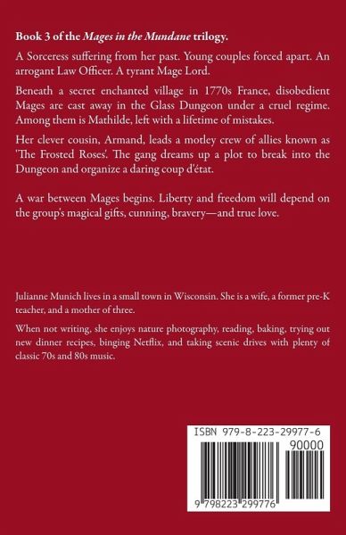 Book 3 of the Mages in the Mundane trilogy. A Sorceress suffering from her past. Young couples forced apart. An arrogant Law Officer. A tyrant Mage Lord. Beneath a secret enchanted village in 1770s France, disobedient Mages are cast away in the Glass Dungeon under a cruel regime. Among them is Mathilde, left with her family secret and a lifetime of mistakes. Her clever cousin, Armand, leads a motley crew of allies known as 'The Frosted Roses'. The gang dreams up a plot to break into the Dungeon and organize a daring coup d'état. A war between Mages begins. Liberty and freedom will depend on the group's magical gifts, cunning, bravery-and true love.