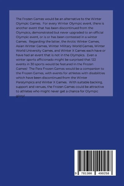 The Frozen Games, as described in the book, would be an alternative to the Winter Olympic Games. For every event in the Winter Olympics, there is another event that was formerly in the Winter Olympics but has been discontinued, was demonstrated but never upgraded to an official Olympic event, or is or has been contested in other winter Games. Regarding those, the Arctic Winter Games, Asian Winter Games, Winter Military World Games, Winter World University Games, and Winter X Games each have or have had several events that are not on the Winter Olympic program. The historical Nordic Games, which preceded the Winter Olympics, also had a few events that did not make it into the latter. Even a winter sports afficionado might be surprised that there are 122 events across 30 sports that qualify for the Frozen Games! The Para Frozen Games would be a companion to the Frozen Games, with sports and events for athletes with disabilities. With suitable backing, support and venues, the Frozen Games could become a major attraction for athletes who might never taste Olympic glory!