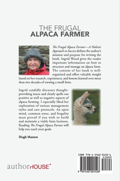 Th e Frugal Alpaca Farmer—A Holistic Approach to Success defi nes the author’s mission and purpose for writing the book. Ingrid Wood gives the reader important information on how to structure and manage an alpaca farm. The content of her book is wellorganized and off ers valuable insight based on her research, experiences, and lessons learned over more than two decades of owning a small farm. Ingrid candidly discusses thought provoking issues and clearly spells out positive as well as negative aspects of alpaca farming. I especially liked her exploration of various management styles and care protocols. An open mind, common sense, and frugality must prevail if you wish to build and maintain a viable farm business. Reading The Frugal Alpaca Farmer will help you reach your goals. Hugh Masters
