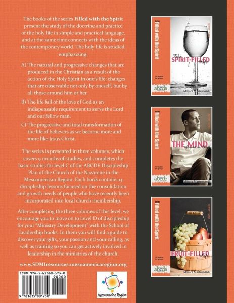 The Christian's life is a continuous walk in the process of discipleship, in which our whole being is being transformed to become like Jesus Christ through the Holy Spirit's work in us. All of us who have been "born again" need to participate in this process of formation so that we can become mature and holy Christians in all areas of our lives. This volume titled: The Fruit-Filled Life, is the third of a three-volume series that completes the basic studies for level C of the ABCDE Discipleship Plan of the Church of the Nazarene in the Mesoamerica Region. The series is called: Filled with the Spirit and covers 9 months of studies. Each book contains 13 discipleship lessons focused on the consolidation and growth needs of people who have recently been incorporated into local church membership. These lessons have been written with the thoughtful discipler/teacher in mind, and offers guidelines about how the teacher should instruct the group of new members in such a way that the class is interesting, dynamic and applicable to their lives. These books present the doctrine and practice of the life of holiness in simple practical language, and at the same time connect with the ideas of the contemporary world. The holy life is studied emphasizing: A. The natural and progressive changes that are produced in the Christian, as a result of the action of the Holy Spirit in one's life; changes that are observable not only by oneself, but by all those around him or her. B. The life full of the love of God as an indispensable requirement to serve the Lord and our fellow man. C. The progressive and total transformation of the life of believers as we become more and more like Jesus Christ. This third book in the series: The Fruit-Filled Life, has the purpose of providing tools to the believer to cultivate the fruit of the Holy Spirit in their life and thus personally experience the fullness of God's love and at the same time, be a light reflecting that love full of grace, righteousness, and truth in your home, in your church and in society. Each lesson presents a new opportunity for God to continue to work and transform each disciple so that we all might become more like Jesus in the way we think, in our emotions, and lifestyle, through bible studies, examples and illustrations, self-assessment exercises, reflection, as well as the opportunity to set new goals for spiritual growth.