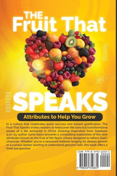 In a culture that celebrates quick success and instant gratification, The Fruit That Speaks invites readers to rediscover the slow but transformative power of a life anchored in Christ. Drawing inspiration from Galatians 5:22-23 KJV, author Juma Salim presents a compelling exploration of the nine attributes of the fruit of the Spirit, virtues that reflect God's character and shape authentic Christian living. Through engaging biblical insights, real-life examples, and practical guidance, The Fruit That Speaks shows how each attribute-love, joy, peace, longsuffering, gentleness, goodness, faith, meekness, and temperance-works together as a cohesive testimony. Instead of promoting superficial checklists or rigid legalism, Juma focuses on heart transformation, teaching that genuine fruit grows through abiding in Christ and embracing the Holy Spirit's gentle guidance. Whether you're a seasoned believer longing for deeper growth or a curious seeker wanting to understand genuine faith, this book offers a fresh perspective on spiritual maturity.