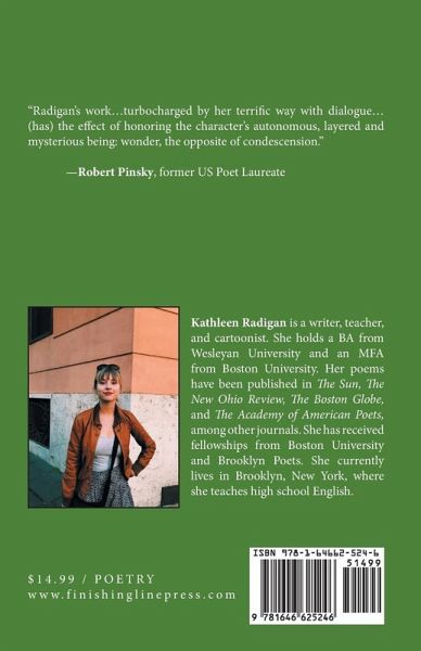 "Radigan's work...turbocharged by her terrific way with dialogue... (has) the effect of honoring the character's autonomous, layered and mysterious being: wonder, the opposite of condescension." -Robert Pinsky, former US Poet Laureate
