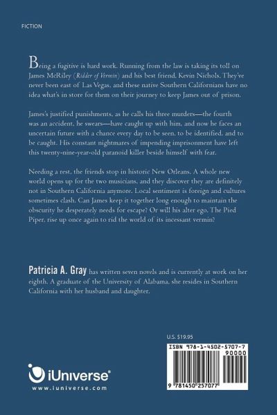 Being a fugitive is hard work. Running from the law is taking its toll on James McRiley (Ridder of Vermin) and his best friend, Kevin Nichols. They've never been east of Las Vegas, and these native Southern Californians have no idea what's in store for them on their journey to keep James out of prison. James's justified punishments, as he calls his three murders-the fourth was an accident, he swears-have caught up with him, and now he faces an uncertain future with a chance every day to be seen, to be identified, and to be caught. His constant nightmares of impending imprisonment have left this twenty-nine-year-old paranoid killer beside himself with fear. Needing a rest, the friends stop in historic New Orleans. A whole new world opens up for the two musicians, and they discover they are definitely not in Southern California anymore. Local sentiment is foreign and cultures sometimes clash. Can James keep it together long enough to maintain the obscurity he desperately needs for escape? Or will his alter ego, The Pied Piper, rise up once again to rid the world of its incessant vermin?