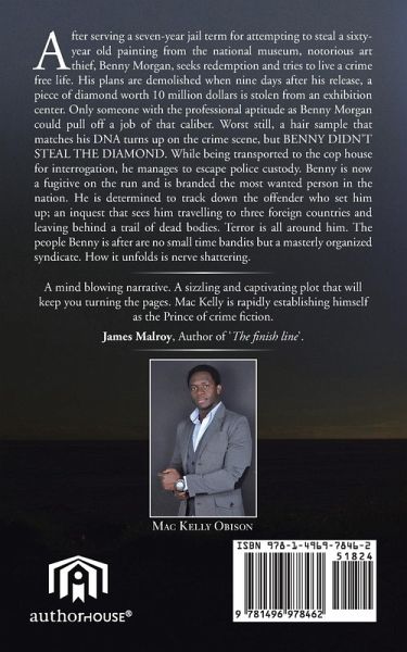After serving a seven-year jail term for attempting to steal a sixty-year old painting from the national museum, notorious art thief, Benny Morgan, seeks redemption and tries to live a crime free life. His plans are demolished when nine days after his release, a piece of diamond worth 10 million dollars is stolen from an exhibition center. Only someone with the professional aptitude as Benny Morgan could pull off a job of that caliber. Worst still, a hair sample that matches his DNA turns up on the crime scene, but BENNY DIDN'T STEAL THE DIAMOND. While being transported to the cop house for interrogation, he manages to escape police custody. Benny is now a fugitive on the run and is branded the most wanted person in the nation. He is determined to track down the offender who set him up; an inquest that sees him travelling to three foreign countries and leaving behind a trail of dead bodies. Terror is all around him. The people Benny is after are no small time bandits but a masterly organized syndicate. How it unfolds is nerve shattering.
