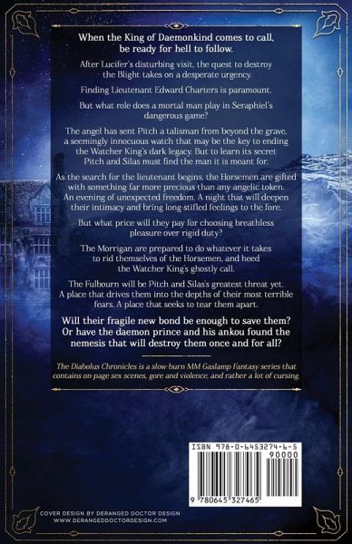 When the King of Daemonkind comes to call, be ready for hell to follow. After Lucifer's disturbing visit, the quest to destroy the Blight takes on a desperate urgency. Finding Lieutenant Edward Charters is paramount. But what role does a mortal man play in Seraphiel's dangerous game? The angel has sent Pitch a talisman from beyond the grave, a seemingly innocuous watch that may be the key to ending the Watcher King's dark legacy. But to learn its secret Pitch and Silas must find the man intended to carry it. As the search for the lieutenant begins, the Horsemen find themselves gifted with something more precious than any angelic token. An evening of unexpected freedom. A night that will deepen their intimacy and bring long-stifled feelings to the fore. But what price will they pay for choosing breathless pleasure over rigid duty? The Morrigan have not forgiven the destruction at the greensward. They are prepared to do whatever it takes to rid themselves of the Horsemen and heed the Watcher King's ghostly call. The Fulbourn is Pitch and Silas's greatest threat yet. A place that will drive them into the depths of their most terrible fears and seek to tear them apart. They are closer than ever before but will that fragile new bond be enough to save them? Or have the daemon prince and his ankou found the nemesis that will destroy them once and for all? The Diabolus Chronicles is a slow-burn MM Gaslamp Fantasy series that contains on-page sex scenes, gore and violence, and rather a lot of cursing. This is the fifth book in the on-going series.