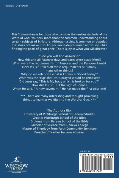 This Commentary is for those who consider themselves students of the Word of God. You seek more than the common understanding about certain subjects of Scripture. Although a view is common or popular, that does not make it so. For you an in-depth search and study is like finding the pearl of great price. There is joy in what you will discover. Inside you will find answers to: How this and all Passover days and dates were established? What were the requirements for Passover and the Passover Lamb? How Jesus fulfilled all these requirements plus many, many other things? Why do we celebrate what is known as 'Good Friday'? What was the 'cup' that Jesus prayed would be removed? Did Jesus say, "This is My body which is broken for you?" How did Jesus fulfill the Sign of Jonah? When He said, "A new covenant," He has made the first obsolete! *** There are many interesting and thought provoking things to learn as we dig into the Word of God. ***