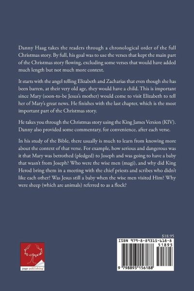 Danny Haag takes the readers through a chronological order of the full Christmas story. By full, his goal was to use the verses that kept the main part of the Christmas story flowing, excluding some verses that would have added much length but not much more context. It starts with the angel telling Elizabeth and Zacharias that even though she has been barren, at their very old age, they would have a child. This is important since Mary (soon-to-be Jesus's mother) would come to visit Elizabeth to tell her of Mary's great news. He finishes with the last chapter, which is the most important part of the Christmas story. He takes you through the Christmas story using the King James Version (KIV). Danny also provided some commentary, for convenience, after each verse. In his study of the Bible, there usually is much to learn from knowing more about the context of that verse. For example, how serious and dangerous was it that Mary was betrothed (pledged) to Joseph and was going to have a baby that wasn't from Joseph? Who were the wise men (magi), and why did King Herod bring them in a meeting with the chief priests and scribes who didn't like each other? Was Jesus still a baby when the wise men visited Him? Why were sheep (which are animals) referred to as a flock?
