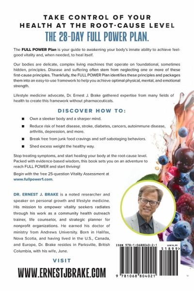 Take control of your health and vitality with the 28-day FULL POWER Plan. The FULL POWER Plan is your guide to awakening your body's innate ability to achieve feel-good vitality and, when needed, to heal itself. Our bodies are delicate, complex living machines that operate on foundational, sometimes hidden, principles. Disease and suffering often stem from neglecting one or more of the first-cause principles. Thankfully, The FULL POWER Plan identifies these principles and packages them into an easy-to-use framework to help you achieve optimal physical, mental, and emotional strength. Lifestyle medicine advocate, Dr. Ernest J. Brake gathered expertise from many fields of health to create this framework without pharmaceuticals. Discover how to:Own a sleeker body and a sharper mind. Reduce risk of heart disease, stroke, diabetes, cancers, autoimmune disease, arthritis, depression, and more. Break free from junk food cravings and self-sabotaging behaviors. Shed excess weight the healthy way. Stop treating symptoms, and start healing your body at the root-cause level. Packed with evidence-based wisdom, this book sets you on an adventure to reach FULL POWER and start thriving! Begin with the free 25-question Vitality Assessment at www.fullpower1.com.