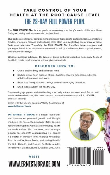Take control of your health and vitality with the 28-day FULL POWER Plan. The FULL POWER Plan is your guide to awakening your body's innate ability to achieve feel-good vitality and, when needed, to heal itself. Our bodies are delicate, complex living machines that operate on foundational, sometimes hidden, principles. Disease and suffering often stem from neglecting one or more of the first-cause principles. Thankfully, The FULL POWER Plan identifies these principles and packages them into an easy-to-use framework to help you achieve optimal physical, mental, and emotional strength. Lifestyle medicine advocate, Dr. Ernest J. Brake gathered expertise from many fields of health to create this framework without pharmaceuticals. Discover how to:Own a sleeker body and a sharper mind. Reduce risk of heart disease, stroke, diabetes, cancers, autoimmune disease, arthritis, depression, and more. Break free from junk food cravings and self-sabotaging behaviors. Shed excess weight the healthy way. Stop treating symptoms, and start healing your body at the root-cause level. Packed with evidence-based wisdom, this book sets you on an adventure to reach FULL POWER and start thriving! Begin with the free 25-question Vitality Assessment at www.fullpower1.com.
