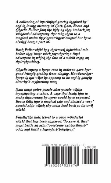 A collection of interlinked stories inspired by and in loving memory of Ceri, Sam, Becca and Charlie Fuller. Join the kids as they embark on wonderful adventures that take them to a magical realm they never knew existed but have always been a part of. Each Fuller child has their own individual tale before they must work together in a final adventure in which the fate of a world rests on their shoulders. Charlie enters a horse race in order to save her good friend's stables from closing. However, her horse is not what he appears to be and is sought after by a mysterious man. Sam must solve puzzle after puzzle whilst investigating a crime. A case that leads him to make discoveries he never could have expected. Becca falls into a magical tale and aboard a very special ship which she must lead back to its own world. Finally, the kids travel to a once wonderful world that has been enslaved. To save it, they must battle an army, overcome extraordinary odds and fulfil a legendary prophecy.