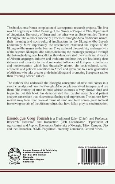 This book stems from a compilation of two separate research projects. The first was A Long Essay entitled Meaning of the Names of People in Mbo, Department of Linguistics, University of Buea and the other was an Essay entitled Time in Lekongho. The authors succinctly presented Nkongho- Mbo traditional names, their meaning and socio-cultural implications in the Nkongho-Mbo Speech Community. Most importantly, the researchers examined the impact of the Nkongho- Mbo names to the bearers. They explored the positivity and negativity of the selected Nkongho- Mbo names, including the meanings portrayed through the Lekongho language. In addition, they demonstrated the wealth and diversity of African languages, cultures and traditions and how they are fast losing their richness and diversity to the domineering influence of European colonialism and modernization which has drastically altered the socio-cultural, socio-economic and political conditions in Africa and given rise to a new generation of Africans who take greater pride in imbibing and promoting Europeans rather than fostering African values. The authors also addressed the Nkongho conception of time and names in a succinct analysis of how the Nkongho-Mbo people conceived, interpret and use them. The concept of time in most African cultures is very elusive, fluid and imprecise but this book has demonstrated that careful research and patient analysis can reduce that elusiveness, fluidity and imprecision. The authors have moved away from that colonial frame of mind and have shown great interest in reviving certain of the African values that have fallen prey to modernization.