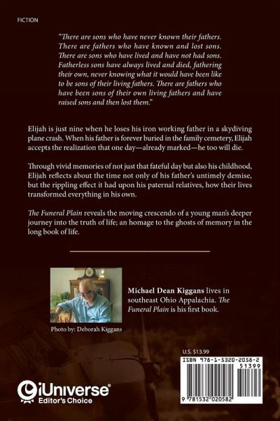 Elijah is just nine when he loses his iron working father in a skydiving plane crash. When his father is forever buried in the family cemetery, Elijah accepts the realization that one day-already marked-he too will die. Through vivid memories of not just that fateful day but also his childhood, Elijah reflects about the time not only of his father's untimely demise, but the rippling effect it had upon his paternal relatives, how their lives transformed everything in his own. The Funeral Plain reveals the moving crescendo of a young man's deeper journey into the truth of life; an homage to the ghosts of memory in the long book of life. The Funeral Plain is an award-winning Finalist for the 2018 Next Generation Indie Book Awards in the two categories of First Novel (60,000-80,000 words) and General Fiction/Novel (under 80,000 words), and an iUniverse Editor's Choice.