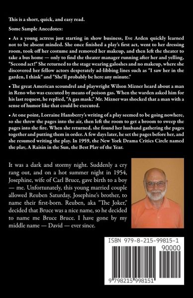 This is a short, quick, and easy read. Some Sample Anecdotes: ¿ As a young actress just starting in show business, Eve Arden quickly learned not to be absent minded. She once finished a play's first act, went to her dressing room, took off her costume and removed her makeup, and then left the theater to take a bus home - only to find the theater manager running after her and yelling, "Second act!" She returned to the stage wearing galoshes and no makeup, where she discovered her fellow actors desperately ad-libbing lines such as "I saw her in the garden, I think" and "She'll probably be here any minute." ¿ The great American scoundrel and playwright Wilson Mizner heard about a man in Reno who was executed by means of poison gas. When the warden asked him for his last request, he replied, "A gas mask." Mr. Mizner was shocked that a man with a sense of humor like that could be executed. ¿ At one point, Lorraine Hansberry's writing of a play seemed to be going nowhere, so she threw the pages into the air, then left the room to get a broom to sweep the pages into the fire. When she returned, she found her husband gathering the pages together and putting them in order. A few days later, he set the pages before her, and she resumed writing the play. In 1959, the New York Drama Critics Circle named the play, A Raisin in the Sun, the Best Play of the Year. ¿ A production of Bohème in Hamburg involved nudity. A young woman playing Euphémie, Schaunard's girlfriend, appeared completely nude to model for a picture and donned clothing only when Rodolfo worried that she might catch cold. At a dress rehearsal, things went fine until the nude actress appeared and the members of the orchestra tried to play their instruments in strange positions so they could turn around and look at the nude actress. Of course, this caused havoc with the music. The conductor, Nello Santi, solved this problem by asking the nude actress if she would walk to the end of the stage for a few moments so the members of the orchestra could look at her. She didn't mind, the members of the orchestra got a good look, and then the rest of the rehearsal proceeded smoothly. ¿ In England, to "give someone the bird" means to boo them. On the New York opening night of Bitter Sweet, Noël Coward walked into Evelyn Laye's dressing room and presented her with a silver box. When she opened the box, a mechanical bird emerged, flapped its wings, and sang. Mr. Coward said, "I wanted to be the first to give you the bird."