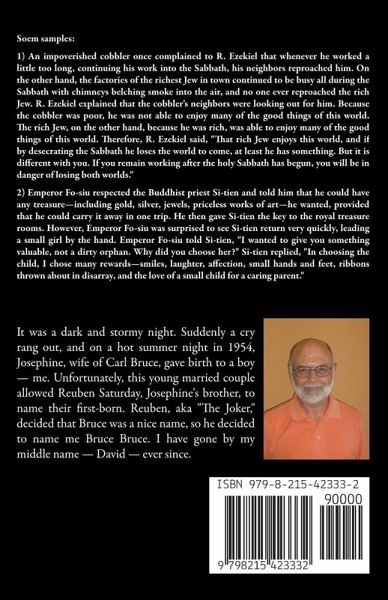 Soem samples: 1) An impoverished cobbler once complained to R. Ezekiel that whenever he worked a little too long, continuing his work into the Sabbath, his neighbors reproached him. On the other hand, the factories of the richest Jew in town continued to be busy all during the Sabbath with chimneys belching smoke into the air, and no one ever reproached the rich Jew. R. Ezekiel explained that the cobbler's neighbors were looking out for him. Because the cobbler was poor, he was not able to enjoy many of the good things of this world. The rich Jew, on the other hand, because he was rich, was able to enjoy many of the good things of this world. Therefore, R. Ezekiel said, "That rich Jew enjoys this world, and if by desecrating the Sabbath he loses the world to come, at least he has something. But it is different with you. If you remain working after the holy Sabbath has begun, you will be in danger of losing both worlds." 2) Emperor Fo-siu respected the Buddhist priest Si-tien and told him that he could have any treasure-including gold, silver, jewels, priceless works of art-he wanted, provided that he could carry it away in one trip. He then gave Si-tien the key to the royal treasure rooms. However, Emperor Fo-siu was surprised to see Si-tien return very quickly, leading a small girl by the hand. Emperor Fo-siu told Si-tien, "I wanted to give you something valuable, not a dirty orphan. Why did you choose her?" Si-tien replied, "In choosing the child, I chose many rewards-smiles, laughter, affection, small hands and feet, ribbons thrown about in disarray, and the love of a small child for a caring parent." 3) Dorothy Parker declined to be weepy. When her husband, Alan Campbell, died, a friend stopped by and asked if he could do anything. Ms. Parker said no, but the friend insisted that there must be something he could do, so Ms. Parker said, "Well, if you insist, go to the corner and get me a tuna on rye, hold the mayo." Ms. Parker once said that she wanted her epitaph to say, "If you can read this, you're too close." 4) Comedian Bill Hicks and his comedian friends loved to watch such religious programs as "The PTL [Praise the Lord and People That Love] Club." They used to make bets about how long it would take the preacher to stop talking about Jesus and start talking about dollars.