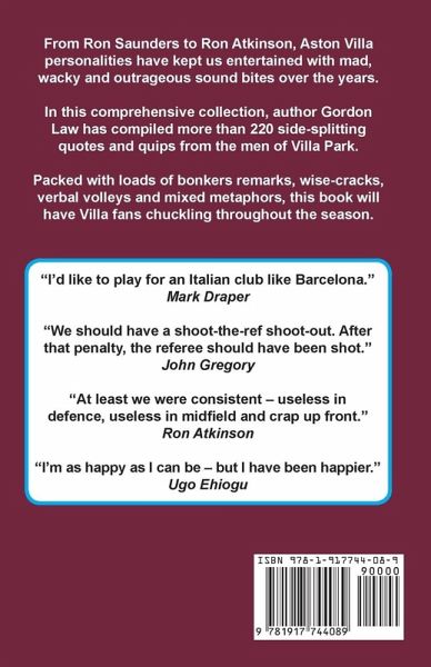 From Ron Saunders to Ron Atkinson, Aston Villa personalities have kept us entertained with mad, wacky and outrageous sound bites over the years. In this comprehensive collection, author Gordon Law has compiled more than 220 side-splitting quotes and quips from the men of Villa Park. Packed with loads of bonkers remarks, wise-cracks, verbal volleys and mixed metaphors, this book will have Aston Villa FC fans chuckling throughout the season.