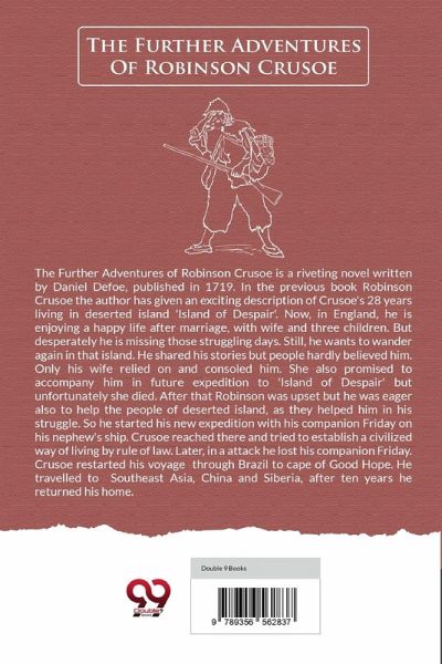The Further Adventures of Robinson Crusoe is a riveting novel written by Daniel Defoe, published in 1719. In the previous book Robinson Crusoe the author has given an exciting description of Crusoe's 28 years living in deserted island 'Island of Despair'. Now, in England, he is enjoying a happy life after marriage, with wife and three children. But desperately he is missing those struggling days. Still, he wants to wander again in that island. He shared his stories but people hardly believed him. Only his wife relied on and consoled him. She also promised to accompany him in future expedition…mehr