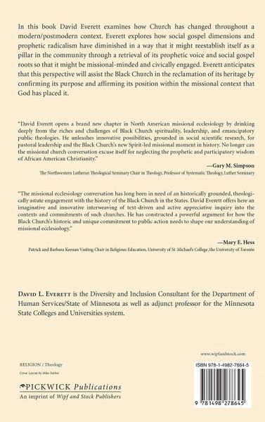 In this book David Everett examines how Church has changed throughout a modern/postmodern context. Everett explores how social gospel dimensions and prophetic radicalism have diminished in a way that it might reestablish itself as a pillar in the community through a retrieval of its prophetic voice and social gospel roots so that it to might be missional-minded and civically-engage. Everett anticipates that this perspective will assist the Black Church in the reclamation of its heritage by confirming its purpose and affirming its position within the missional context that God has placed it. ""David Everett opens a brand new chapter in North American missional ecclesiology by drinking deeply from the riches and challenges of Black Church spirituality, leadership, and emancipatory public theologies. He unleashes innovative possibilities, grounded in social scientific research, for pastoral leadership and the Black Church's new Spirit-led missional moment in history. No longer can the missional church conversation excuse itself for neglecting the prophetic and participatory wisdom of African American Christianity."" --Gary M. Simpson, The Northwestern Lutheran Theological Seminary Chair in Theology, Professor of Systematic Theology, Luther Seminary ""The missional ecclesiology conversation has long been in need of an historically grounded, theologically astute engagement with the history of the Black Church in the states. David Everett offers here an imaginative and innovative interweaving of text-driven and active appreciative inquiry into the contexts and commitments of such churches. He has constructed a powerful argument for how the Black Church's historic and unique commitment to public action needs to shape our understanding of missional ecclesiology."" --Mary E. Hess, PhD, Patrick and Barbara Keenan Visiting Chair in Religious Education, University of St. Michael's College, the University of Toronto David L. Everett is the Diversity and Inclusion Consultant for the Department of Human Services/State of Minnesota as well as adjunct professor for the Minnesota State Colleges and Universities system.