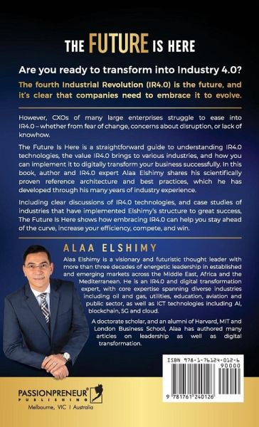 The Future is here, IR4.0 business transformation for value creation book helps CXO of large enterprise aspiring to transform into Business 4.0, through sharing a practically and scientifically proven refence architecture and best practices so they can be ahead of the curve and increase the bottom line. The book has three parts, part one is an introduction, which explains what is IR1,2,3 and IR4.0. It also includes the reference architecture, digital twin, which can help every industry to digitally upgrade their business into IR4.0. The second part is about the technology behind the IR4.0, being the intelligent connectivity, 5G, AI and cloud 2.0. this section explains the technology and give real business use cases and reference cases in a simple business language. The third part is about the intelligent business applications of IR4.0 for value creation. It includes both the explanation of the application and shares successful stories of customers who have implemented these solutions across the globe, in the USA, China, Europe, ME and Africa. There is one full chapter for each industry including, Smart government, Intelligent Oil and Gas, Smart utilities, smart transportation, and digital banking. Grab your copy now and lets begin IR4.0!
