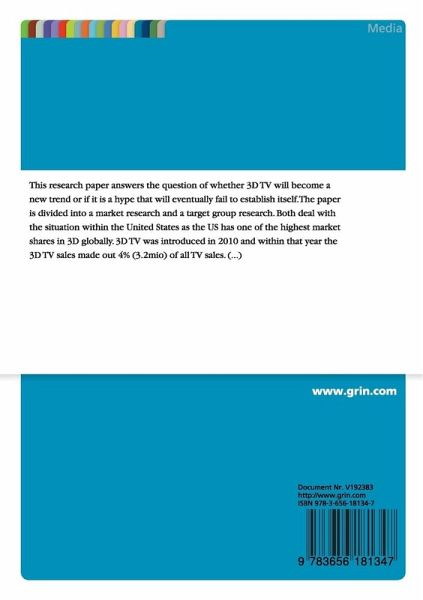 Bachelor Thesis from the year 2011 in the subject Communications - Movies and Television, grade: 1+, Stenden University, language: English, abstract: This research paper answers the question of whether 3D TV will become a new trend or if it is a hype that will eventually fail to establish itself.The paper is divided into a market research and a target group research. Both deal with the situation within the United States as the US has one of the highest market shares in 3D globally.3D TV was introduced in 2010 and within that year the 3D TV sales made out 4% (3.2mio) of all TV sales. Within the US, 3% of the households purchased a 3D TV so far. According to E. Rogers' book "Diffusion of Innovation" whose theory is used as a guideline throughout the whole research paper, those 3% make out the category of innovators.The 3D TV technology has to face economic, sociological and technological challenges. Those challenges as well as the trends and developments influence the adoption of the technology. Those influencing aspects can be grouped into five categories: relative advantage, compatibility, complexibility, observability and trialability.The research determines how the different aspects concerning the 3D technology influence these categories in order to come up with possible forecast of 3D TV.The relative advantage is mainly influenced by the target group's perception of 3D TV. While 3D TV aims to add an experience domain to the traditional experience of 2D TV, this is not especially valued among the target group. The price of 3D TV sets however does play a significant role - many consider the prices of 3D as too high. However the experience teaches that the prices are likely to decrease due to the price setting strategy called "price-skimming".The most important factor concerning compatibility is the unfavorable launch-date of 3D TVs in the US. On the positive side, the increased production of 3D content that fits the target group's profile makes 3D perfectly compatible with the target group's values.Though 3D TV is a rather complex technology, especially in this time now that there is new technology developed all the time, creating an information jungle.In the end and compared with the target group research, it seems as if the 3D TV technology will actually make it and become a new trend.