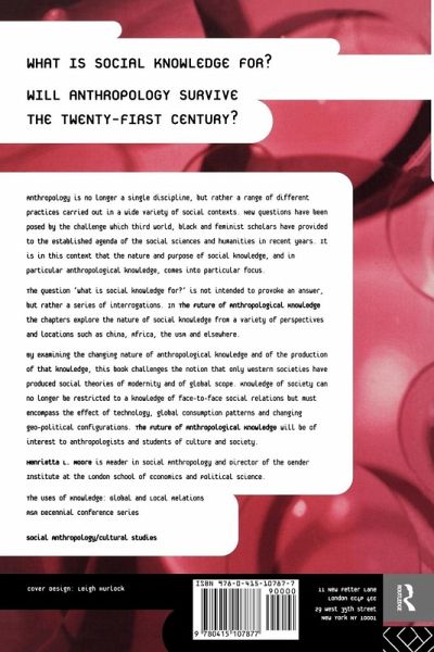 The Future of Anthropological Knowledge the chapters explore the question of the nature of social knowledge from a variety of perspectives and locations such as China, Africa, the USA and elsewhere. By examining the changing nature of anthropological knowledge and of the production of that knowledge, this book challenges the notion that only western societies have produced social theories of modernity and of global scope. Knowledge of society can no longer be restricted to a knowledge of face-to-face social relations but must encompass the effect of technology, global consumption patterns and changing geo-political configurations. The Future of Anthropological Knowledge will be of interest to anthropologists and students of culture and society.