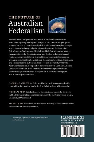 At a time when the operation and reform of federal relations within Australia is squarely on the political agenda, this volume brings together eminent lawyers, economists and political scientists who explain, analyse and evaluate the theory and principles underpinning the Australian federal system. Topics covered include the High Court's approach to the interpretation of the Constitution and how this has influenced federal relations in practice; different forms of inter-governmental co-operative arrangements; fiscal relations between the Commonwealth and the States; and emergent ethno-cultural and socioeconomic diversity within the Australian Federation. Comparative perspectives from Germany, America, Canada, Switzerland, India and the European Union provide unique prisms through which to view the operation of the Australian system and to contemplate its reform.