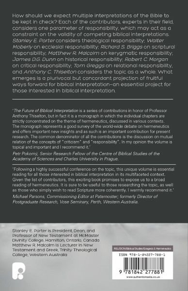 How should we expect multiple interpretations of the Bible to be kept in check? Each of the contributors, experts in the field, considers one parameter of responsibility, which may act as a constraint on the validity of competing biblical interpretations. Stanley E. Porter considers theological resposibility; Walter Moberly on ecclesial reponsibility; Richard S. Briggs on scriptural responsibility; Matthew R Malcolm on kerygmatic responsibility; James D.G. Dunn on historical reponsibility; Robert C. Morgan on critical; Tom Greggs on relational responsibility and Anthony C Thiselton considers the topic as a whole. What emereges is a plurivocal but concordant projection of fruitful ways forward for biblical interpretation.