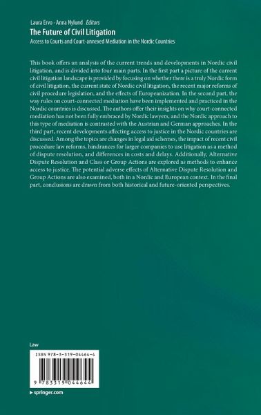 This book offers an analysis of the current trends and developments in Nordic civil litigation and is divided into four main parts. In the first part a picture of the current civil litigation landscape is provided by focusing on whether there is a truly Nordic form of civil litigation, the current state of Nordic civil litigation, the recent major reforms of civil procedure legislation and the effects of Europeanization. In the second part, the way rules on court-connected mediation have been implemented and practiced in the Nordic countries is discussed. The authors offer their insights on why court-connected mediation has not been fully embraced by Nordic lawyers and the Nordic approach to this type of mediation is contrasted with the Austrian and German approaches. In the third part, recent developments affecting access to justice in the Nordic countries are discussed. Among the topics are changes in legal aid schemes, the impact of recent civil procedure law reforms, hindrances for larger companies to use litigation as a method of dispute resolution and differences in costs and delays. Additionally, Alternative Dispute Resolution and Class or Group Actions are explored as methods to enhance access to justice. The potential adverse effects of Alternative Dispute Resolution and Group Actions are also examined, both in a Nordic and European context. In the final part, conclusions are drawn from both historical and future-oriented perspectives.