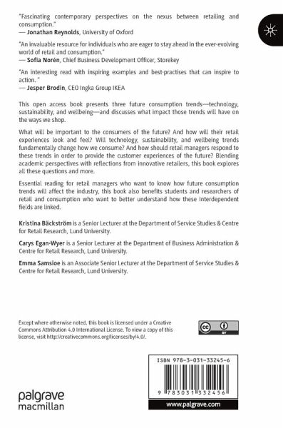 This open access book presents three future consumption trends-technology, sustainability, and wellbeing-and discusses what impact those trends will have on the ways we shop.