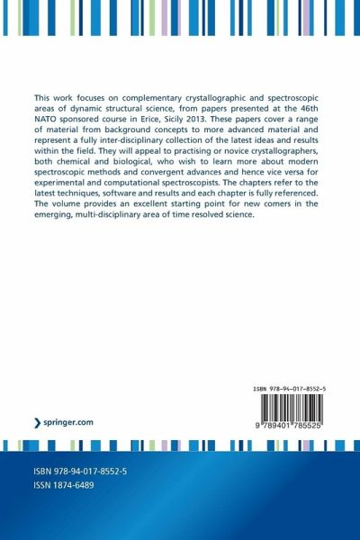 This work focuses on complementary crystallographic and spectroscopic areas of dynamic structural science, from papers presented at the 46th NATO sponsored course in Erice, Sicily 2013. These papers cover a range of material from background concepts to more advanced material and represent a fully inter-disciplinary collection of the latest ideas and results within the field. They will appeal to practising or novice crystallographers, both chemical and biological, who wish to learn more about modern spectroscopic methods and convergent advances and hence vice versa for experimental and computational spectroscopists. The chapters refer to the latest techniques, software and results and each chapter is fully referenced. The volume provides an excellent starting point for new comers in the emerging, multi-disciplinary area of time resolved science.