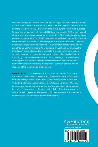 Dynamic pricing and on-line auctions are emerging as the preferred models for e-business. This multi-disciplinary 2001 book presents a framework of negotiation protocols for electronic markets. It was the first book to combine economics with computer science and the first to describe multidimensional auction mechanisms - i.e. automated negotiations on multiple attributes and/or multiple units of a product. In addition it summarises the introductory economics needed to understand electronic markets, and surveys the literature on negotiation and auction theory. Case studies include the trading of financial derivatives. For use in the design, implementation and upgrade of electronic markets, for researchers in: economics, information systems and operations management, computer science and all students of the e-commerce phenomenon.