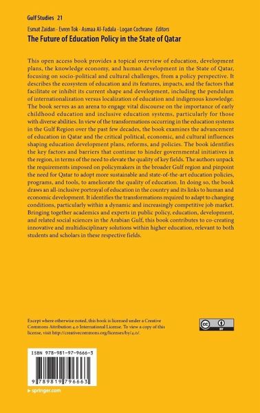 This open access book provides a topical overview of education, development plans, the knowledge economy, and human development in the State of Qatar, focusing on socio-political and cultural challenges, from a policy perspective. It describes the ecosystem of education and its features, impacts, and the factors that facilitate or inhibit its current shape and development, including the pendulum of internationalization versus localization of education and indigenous knowledge. The book serves as an arena to engage vital discourse on the importance of early childhood education and inclusive education systems, particularly for those with diverse abilities. In view of the transformations occurring in the education systems in the Gulf Region over the past few decades, the book examines the advancement of education in Qatar and the critical political, economic, and cultural influences shaping education development plans, reforms, and policies. The book identifies the key factors and barriers that continue to hinder governmental initiatives in the region, in terms of the need to elevate the quality of key fields. The authors unpack the requirements imposed on policymakers in the broader Gulf region and pinpoint the need for Qatar to adopt more sustainable and state-of-the-art education policies, programs, and tools, to ameliorate the quality of education. In doing so, the book draws an all-inclusive portrayal of education in the country and its links to human and economic development. It identifies the transformations required to adapt to changing conditions, particularly within a dynamic and increasingly competitive job market. Bringing together academics and experts in public policy, education, development, and related social sciences in the Arabian Gulf, this book contributes to co-creating innovative and multidisciplinary solutions within higher education, relevant to both students and scholars in these respective fields.