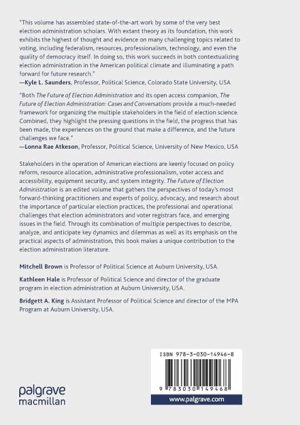 1. Introduction.- 2. The Federal Response and New Considerations for Election Administration.- 3. Parties and Politics: The Evolution of Election Administration.- 4. Accessible and Secure: Improving Voter Confidence by Protecting the Right to Vote.- 5. Challenges in Voter Registration.- 6. Polling Place Quality and Access.- 7. The Evolution of Professionalism in the Field of Election Administration.- 8. The Elections Performance Index: Past, Present, and Future.- 9. Building Terminology in the Field.- 10. Diversity and Descriptive Representation in Election Administration.- 11. Election Costs: A Study of North Carolina.- 12. The Role of Election Vendors in Election Administration.- 13. Election Integrity in Ensuring Accuracy.- 14. Election Security: Increasing Election Integrity by Improving Cyber Security.- 15. Election Audits.- 16. Election Cyber-security.- 17. Special Elections Costs: Filling Legislativeand Congressional Vacancies.- 18. Increasing Confidence in International Elections.- 19. Conclusion.