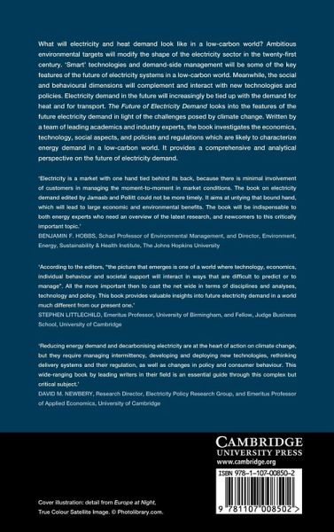 What will electricity and heat demand look like in a low-carbon world? Ambitious environmental targets will modify the shape of the electricity sector in the twenty-first century. 'Smart' technologies and demand-side management will be some of the key features of the future of electricity systems in a low-carbon world. Meanwhile, the social and behavioural dimensions will complement and interact with new technologies and policies. Electricity demand in the future will increasingly be tied up with the demand for heat and for transport. The Future of Electricity Demand looks into the features of the future electricity demand in light of the challenges posed by climate change. Written by a team of leading academics and industry experts, the book investigates the economics, technology, social aspects, and policies and regulations which are likely to characterize energy demand in a low-carbon world. It provides a comprehensive and analytical perspective on the future of electricity demand.