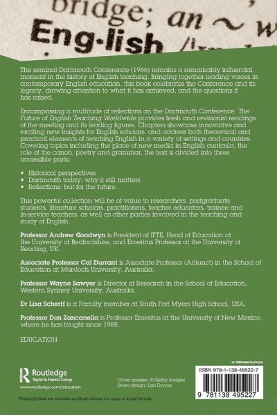 The seminal Dartmouth Conference (1966) remains a remarkably influential moment in the history of English teaching. Bringing together leading voices in contemporary English education, this book celebrates the Conference and its legacy, drawing attention to what it has achieved, and the questions it has raised. Encompassing a multitude of reflections on the Dartmouth Conference, The Future of English Teaching Worldwide provides fresh and revisionist readings of the meeting and its leading figures. Chapters showcase innovative and exciting new insights for English scholars, and address both theoretical and practical elements of teaching English in a variety of settings and countries. Covering topics including the place of new media in English curricula, the role of the canon, poetry and grammar, the text is divided into three accessible parts: Historical perspectives Dartmouth today: why it still matters Reflections: but for the future. This powerful collection will be of value to researchers, postgraduate students, literature scholars, practitioners, teacher educators, trainee and in-service teachers, as well as other parties involved in the teaching and study of English.