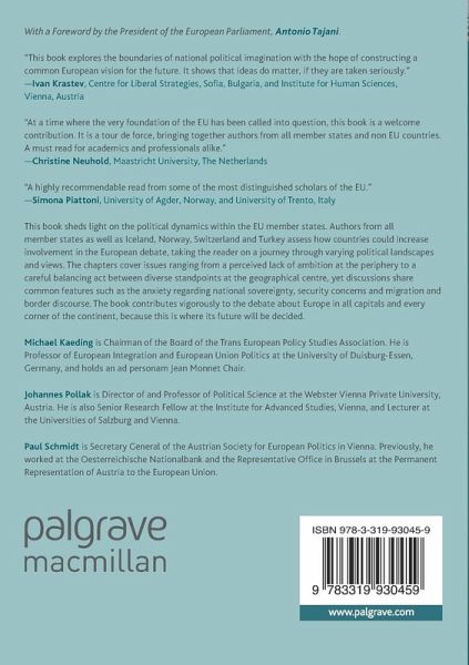 With a Foreword by the President of the European Parliament, Antonio Tajani. This book sheds light on the political dynamics within the EU member states and contributes to the discussions about Europe. Authors from all member states as well as Iceland, Norway, Switzerland and Turkey assess how their country could get more involved in the European debate, taking the reader on a journey through various political landscapes and different views. The chapters cover issues ranging from a perceived lack of ambition at the periphery to a careful balancing act between diverse standpoints at the geographical centre. Yet, discussions share common features such as the anxiety regarding national sovereignty, the migration and border discourse, security concerns as well as the obvious need to regain trust and create policies that work. The book contributes vigorously to the debate about Europe in all capitals and every corner of the continent, because this is where itsfuture will be decided.
