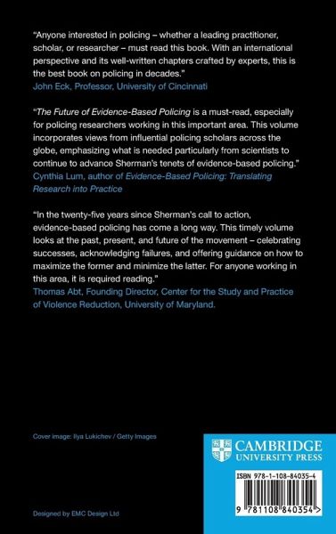 1. The Future of Evidence-Based Policing: Introduction David Weisburd, Tal Jonathan-Zamir, Gali Perry, and Badi Hasisi; Part I. Taking Stock of Evidence-Based Policing: 2. Three Tiers for Evidence-Based Policing: Targeting 'Minimalist Policing with a Risk-Adjusted Disparity Index Lawrence Sherman; 3. Re-Inventing Policing: Using Science to Transform Policing Peter Neyroud and David Weisburd; 4. A Way Ahead: Re-Envisioning the Relationship Between Evidence-Based Policing and the Police Craft James Willis and Heather Toronjo; Part II. The Evidence for Evidence-Based Policing: 5. A Review of Systematic Reviews in Policing Cody W. Telep and David Weisburd; 6. What Do We Know about Proactive Policing's Effects on Crime and Community: Drawing Conclusions from a National Academies of Sciences, Engineering, and Medicine Report David Weisburd, Anthony A. Braga, and Malay Majmundar; 7. Rethinking the Role of the Community in Proactive Policing Charlotte Gill; Part III. Innovations in Tools of Evaluation and Assessment: 8. The Role of Randomized Experiments in Developing the Evidence for Evidence-Based Policing Lorraine Mazerolle, Elizabeth Eggins, Lorelei Hine, and Angela Higginson; 9. The Potential Contribution of Subjective Causality to Policing Research: The Case of the Relationship between Procedural Justice and Police Legitimacy Gali Perry, Tal Jonathan-Zamir, and James Willis; Part IV. Challenges of the Implementation of Evidence-Based Policing: 10. Practitioners' Inclination to Rely on Experience: What does this Mean for Evidence-Based Policing? Tal Jonathan-Zamir and David Weisburd; 11. Implementing Evidence-Based Policing: Findings from a Process Evaluation of the EMUN Reform in the Israel Police Yael Litmanovitz, David Weisburd, and Badi Hasisi; 12. Towards Implementing Evidence-Based Policing: Challenges in Latin America and Caribbean Laura Jaitman; 13. Evidence-Based Policing and the Law: The American Perspective Rachel Harmon; Part V. The Practitioner's Perspective: 14. The Role of the 'Super Evidence Cop' in Evidence-Based Policing: The Israeli Case Simon Perry and Michael Wolfowitz; 15. Looking Back on the Challenges to Evidence-Based Policing: A Chief's Perspective Darrel Stephens; 16. Support for Evidence-Based Policing at the National Level - More Help Than Harm? James H. Burch; 17. Conclusions: Police Science and the Future of Evidence-Based Policing David Weisburd, Tal Jonathan-Zamir, Gali Perry, and Badi Hasisi.