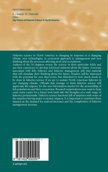 Authors of the 34 chapters review the science in their particular fields and use their experience to develop informed opinions about the future. Everyone associated with fish, fisheries and fisheries management will find material that will stimulate their thinking about the future. Readers will be impressed with the potential for new discoveries, but disturbed by how much needs to be done in fisheries science if we are to sustain North American fisheries in our changing climate. Officials that manage or fund fisheries science will appreciate the urgency for the new information needed for the stewardship of fish populations and their ecosystems. Research organizations may want to keep some extra copies for a future look back into the thoughts of a wide range of fisheries professionals. Fisheries science has been full of surprises with some of the surprises having major economic impacts. It is important to minimize these impacts as the demand for seafood increases and the complexities of fisheries management increase.