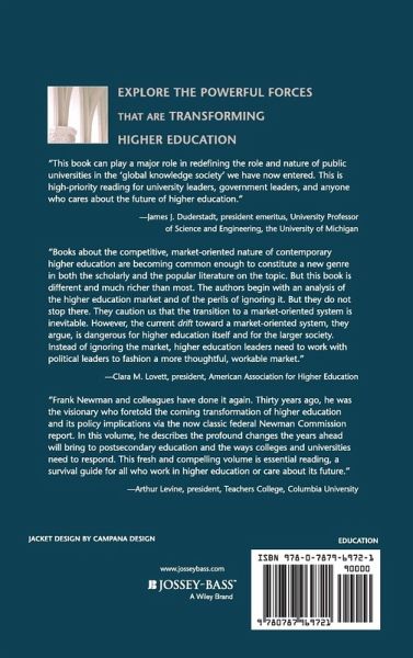 Explore the Powerful Forces That are Transforming Higher Education "This book can play a major role in redefining the role and nature of public universities in the 'global knowledge society' we have now entered. This is high-priority reading for university leaders, government leaders, and anyone who cares about the future of higher education." -James J. Duderstadt, president emeritus, University Professor of Science and Engineering, the University of Michigan "Books about the competitive, market-oriented nature of contemporary higher education are becoming common enough to constitute a new genre in both the scholarly and the popular literature on the topic. But this book is different and much richer than most. The authors begin with an analysis of the higher education market and of the perils of ignoring it. But they do not stop there. They caution us that the transition to a market-oriented system is inevitable. However, the current drift toward a market-oriented system, they argue, is dangerous for higher education itself and for the larger society. Instead of ignoring the market, higher education leaders need to work with political leaders to fashion a more thoughtful, workable market." -Clara M. Lovett, president, American Association for Higher Education "Frank Newman and colleagues have done it again. Thirty years ago, he was the visionary who foretold the coming transformation of higher education and its policy implications via the now classic federal Newman Commission report. In this volume, he describes the profound changes the years ahead will bring to postsecondary education and the ways colleges and universities need to respond. This fresh and compelling volume is essential reading, a survival guide for all who work in higher education or care about its future." -Arthur Levine, president, Teachers College, Columbia University